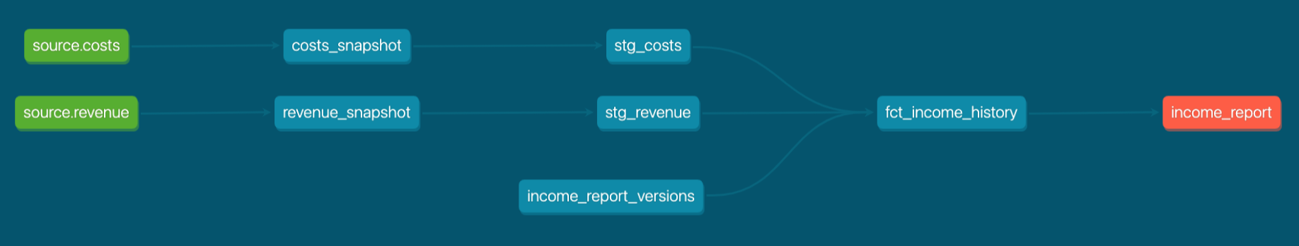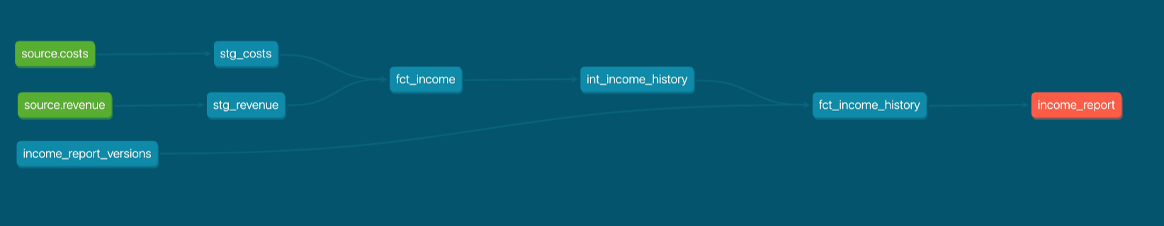 to join in the seed file to determine which versions are “correct”. Her new DAG looks like this, where int_income_history